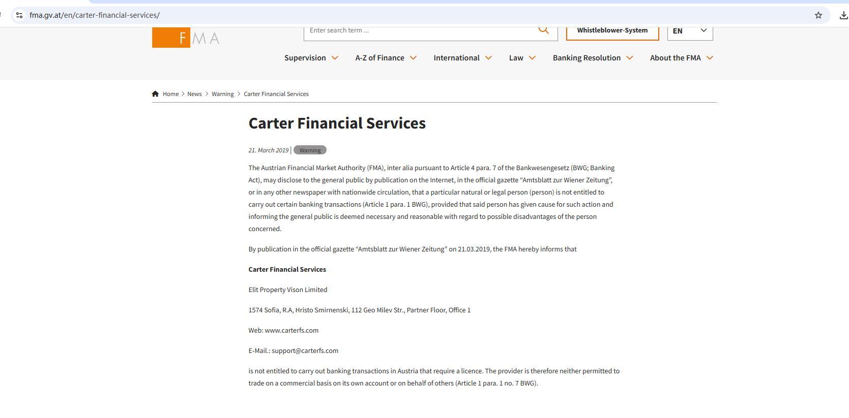 carter financial services ngày phát hành: 21 tháng 3 năm 2019 | danh mục: cảnh báo cơ quan thị trường tài chính Áo (fma), trong số những điều khác theo điều 4 đoạn 7 của bankwesengesetz (bwg; luật ngân hàng), có thể tiết lộ cho công chúng bằng cách công bố trên internet, trên công báo chính thức “amtsblatt zur wiener zeitung”, hoặc trên bất kỳ tờ báo nào khác có phát hành toàn quốc, rằng một cá nhân hoặc pháp nhân cụ thể (cá nhân) không được phép thực hiện một số giao dịch ngân hàng nhất định (điều 1 đoạn 1 bwg), với điều kiện là người đó đã đưa ra lý do cho hành động đó và việc thông báo cho công chúng được coi là cần thiết và hợp lý liên quan đến những bất lợi có thể xảy ra đối với người có liên quan. bằng cách công bố trên công báo chính thức “amtsblatt zur wiener zeitung” vào ngày 21.03.2019, fma xin thông báo rằng carter financial services elit property vison limited 1574 sofia, ra, hristo smirnenski, 112 geo milev str., partner floor, office 1 web: www. CarterFS.com email: support@ CarterFS.com không được phép thực hiện các giao dịch ngân hàng tại Áo yêu cầu phải có giấy phép. Do đó, nhà cung cấp không được phép giao dịch trên cơ sở thương mại cho chính mình hoặc thay mặt cho người khác (điều 1 đoạn 1 số 7 bwg).