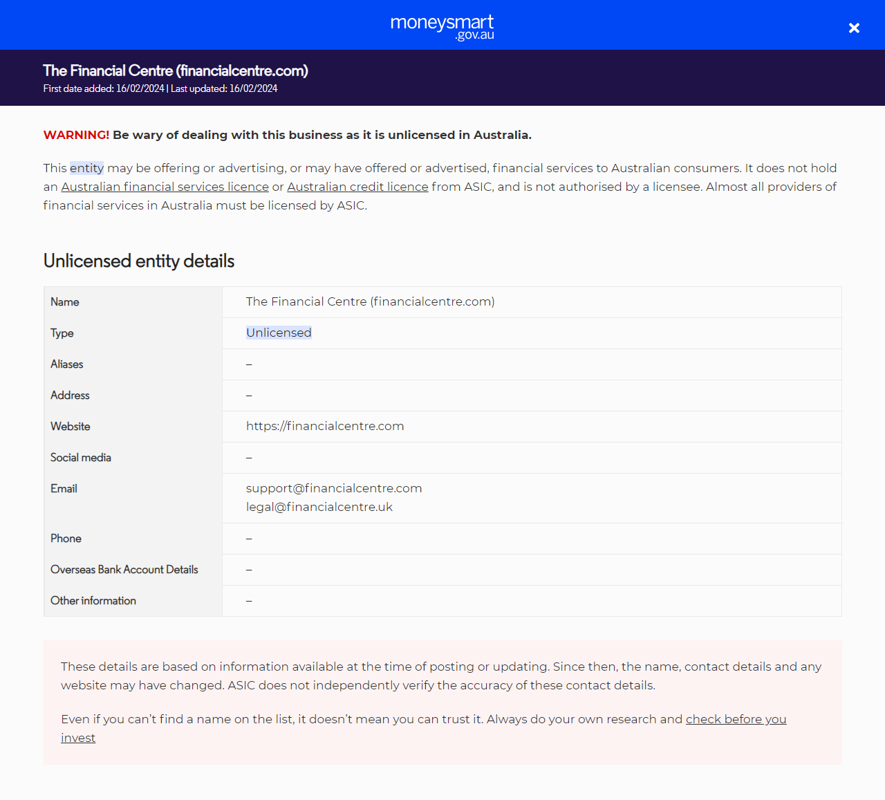 danh sách cảnh báo nhà đầu tưThe Financial Centre (financialcentre.com).