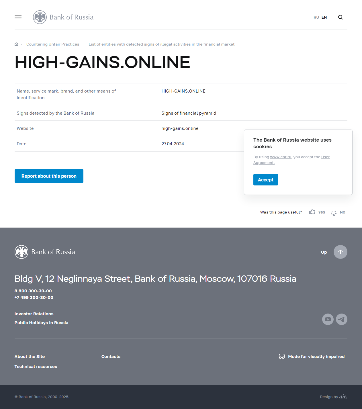 Danh sách các thực thể có dấu hiệu phát hiện hoạt động bất hợp pháp trên thị trường tài chính HIGH-GAINS.ONLINE.
