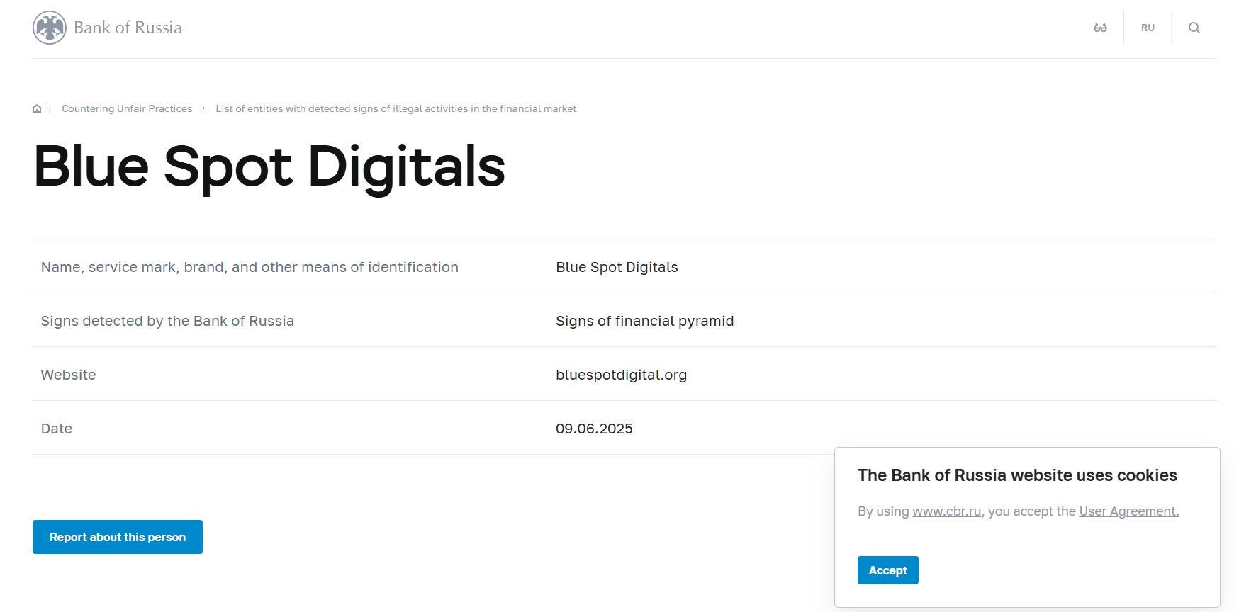 Danh sách các thực thể có dấu hiệu phát hiện hoạt động bất hợp pháp trên thị trường tài chính Blue Spot Digitals.