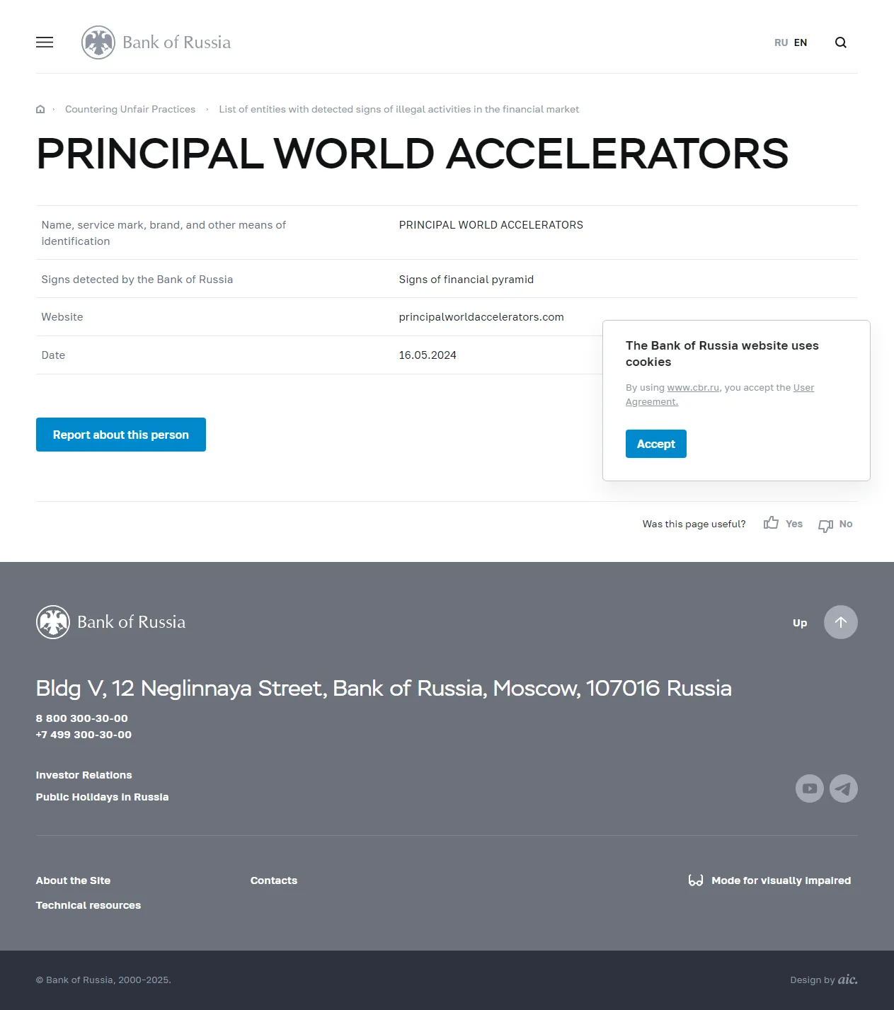 Tên, nhãn hiệu dịch vụ, thương hiệu và các phương tiện nhận dạng khác CÁC TỔ CHỨC TÀI CHÍNH HÀNG ĐẦU THẾ GIỚI Dấu hiệu được Ngân hàng Trung ương Nga phát hiện Dấu hiệu của mô hình kim tự tháp tài chính Trang web principalworldaccelerators.com Ngày 16.05.2024.