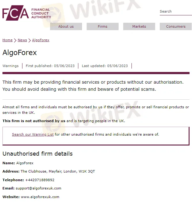 FCA警告称:AlgoForex 在未经我们授权的情况下在英国提供金融服务或产品,如果一旦遭受资金损失,您将无法使用金融申诉专员服务或受到金融服务补偿计划 (FSCS) 的保护。