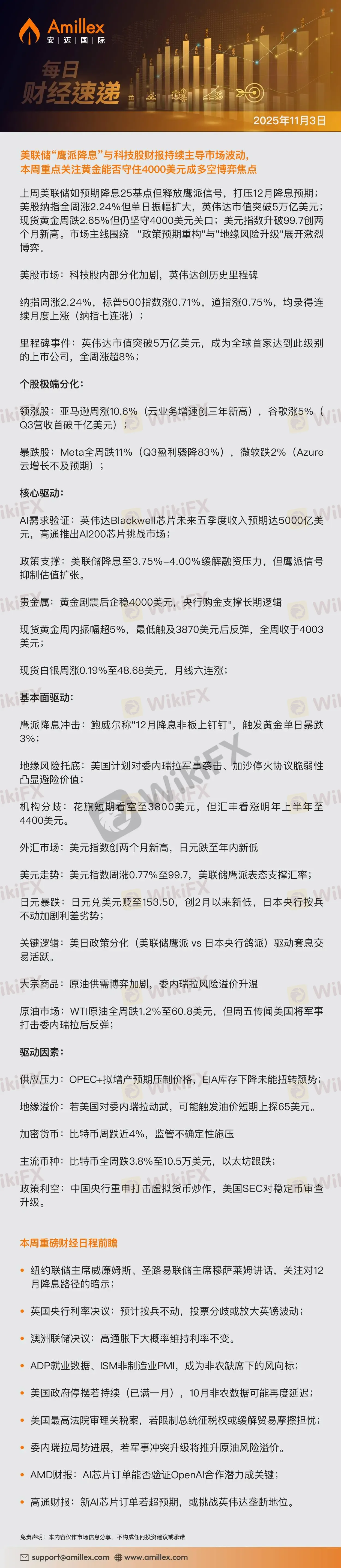 Amillex每日汇评:美联储“鹰派降息”与科技股财报持续主导市场波动,本周重点关注黄金能否守住4000美元成多空博弈焦点