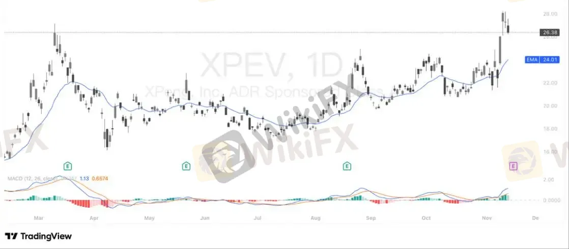 整体而言,XPEV 当前处于“强势突破后的小幅回踩”,技术面健康,回挡反而为财报前的低风险布局窗口。短线支撑看 25 与 24,突破 28 则视为下一波趋势启动信号。