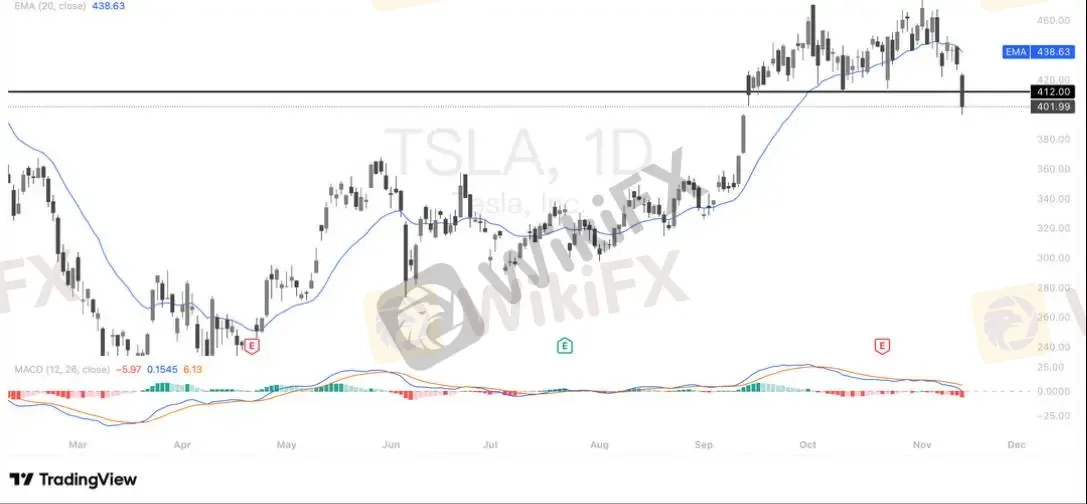 Tesla 的技术结构已全面转弱。本周早些时候已提示特斯拉出现潜在M顶形态,昨日的大阴线正式 跌破颈线(约 412 美元),不仅确认了该反转结构,也触发了技术面的系统性卖压。加上股价同步跌破 20 日 EMA(438),形成“结构反转+均线破位”的双重空头讯号。