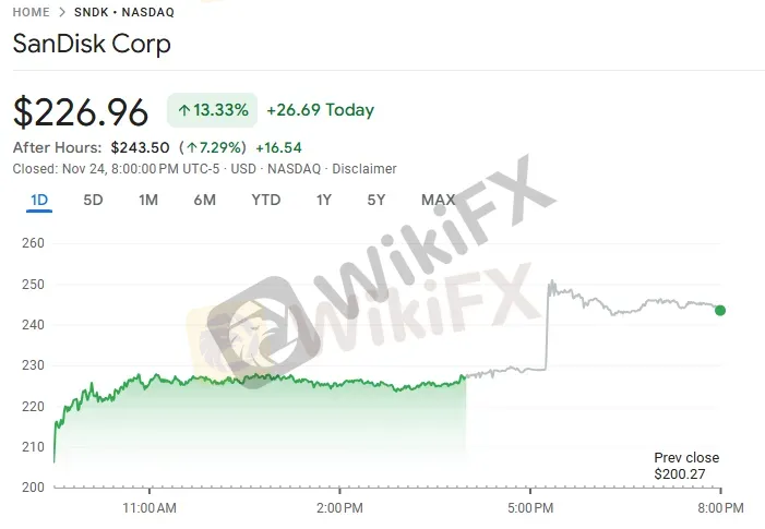 SanDisk 自 2025 年 2 月自 Western Digital 分拆独立上市以来,仅用 9 个月便从 SmallCap 600 跃升至 S&P 500,股价从 36 美元暴涨至 226.96 美元,累计上涨 5.3 倍,突显市场对其 AI 数据中心存储业务爆发式成长的高度认可。