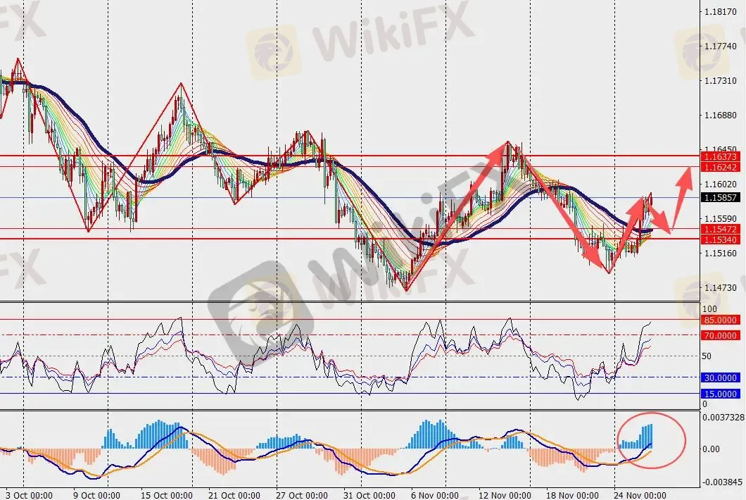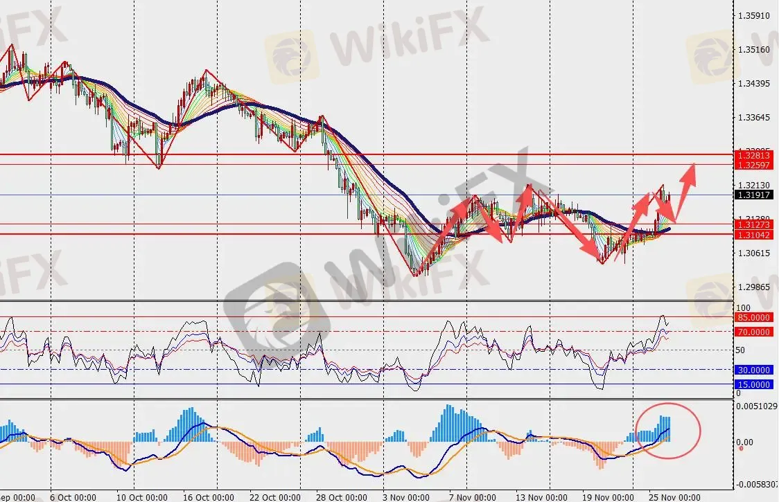 技术面:英镑兑美元H4级别震荡反弹,并在48日多空分界线上方运行。此外,MACD双线和量能柱在零轴附近扩张。里夫斯面临200亿英镑的财政窟窿,必须着手修复英国财政。这迫使她不得不拟订一揽子大幅增税方案。