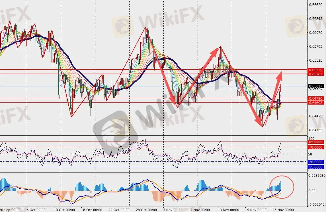 技术面:澳元兑美元H4级别突破上涨,并在48日多空分界线上方运行。此外,MACD双线和量能柱在零轴附近扩张。总体而言,CPI的发布几乎可以肯定,澳洲联储近期将按兵不动。