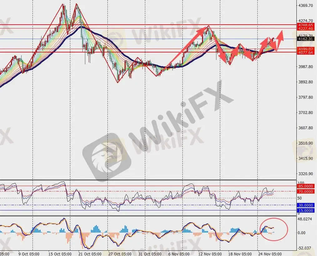 技术面:原油H4级别下跌反弹,并依旧在48日多空分界线下方运行。另一方面,MACD双线和量能柱在零轴下方扩张。乌克兰暗示可能接受美国提出的和平协议框架,引发市场对俄乌战争结束及后续俄罗斯石油供应重返市场的担忧。