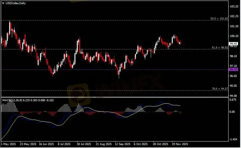日线图显示美元指数震荡下跌,当前仍收于98.80支撑。从MACD来看,快慢线形成死叉,红色动能柱温和放量。指数走势基本和动能柱的变化一致。