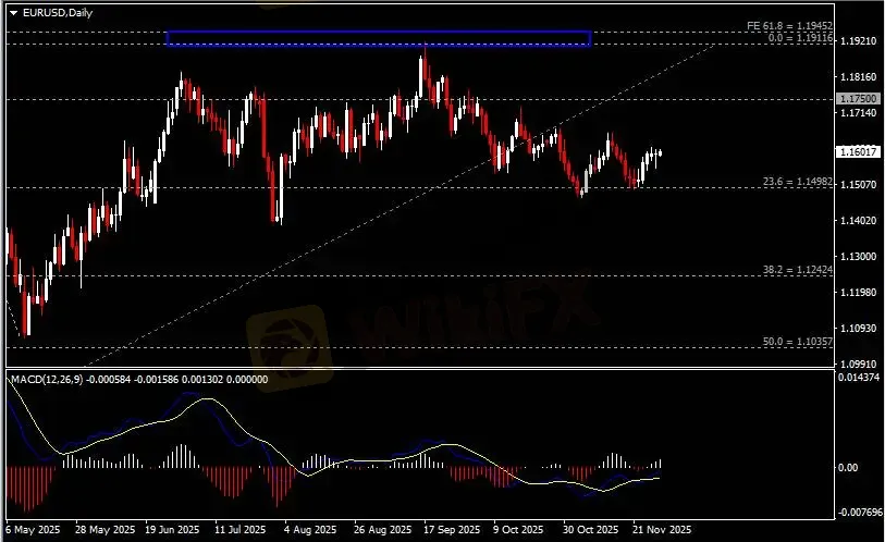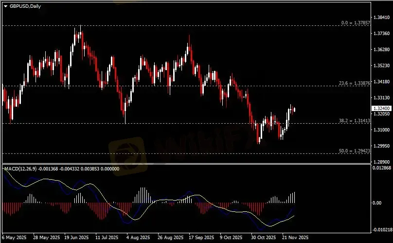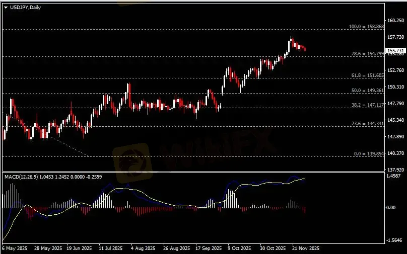 日线图显示美元兑日元高位回调,当前收于154.80支撑。从MACD来看,快慢线形成死叉,红色动能柱温和放量。汇价走势基本和动能柱的变化一致。