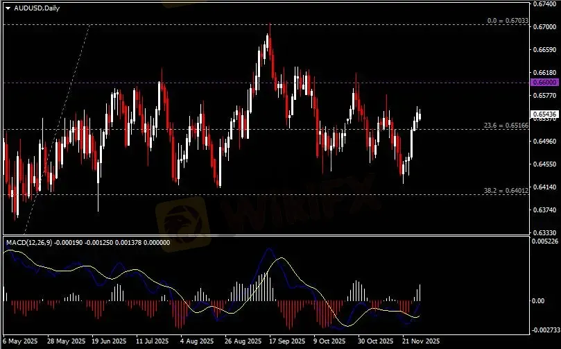 日线图显示澳元兑美元震荡走强,当前企稳于0.6520支撑。从MACD来看,快慢线向上运行,白色动能柱温和放量。汇价走势基本和动能柱的变化一致。