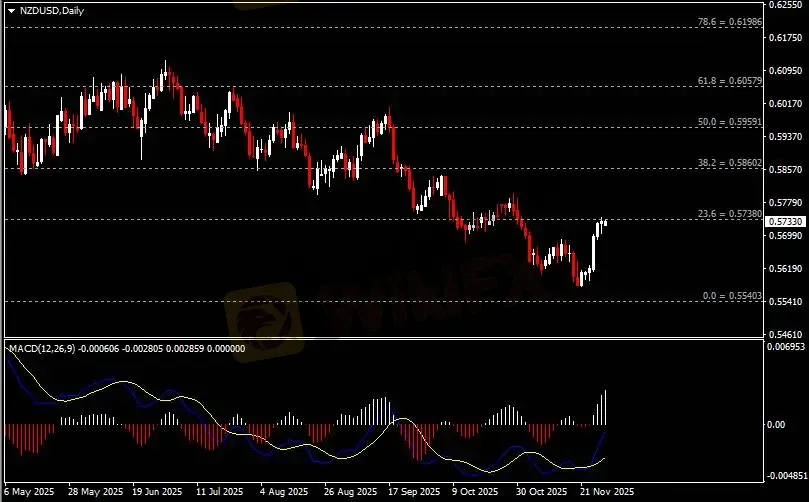日线图显示纽元兑美元震荡上行,当前测试0.5740阻力。从MACD来看,快慢线向上扩张,白色动能柱温和放量。汇价走势基本和动能柱的变化一致。