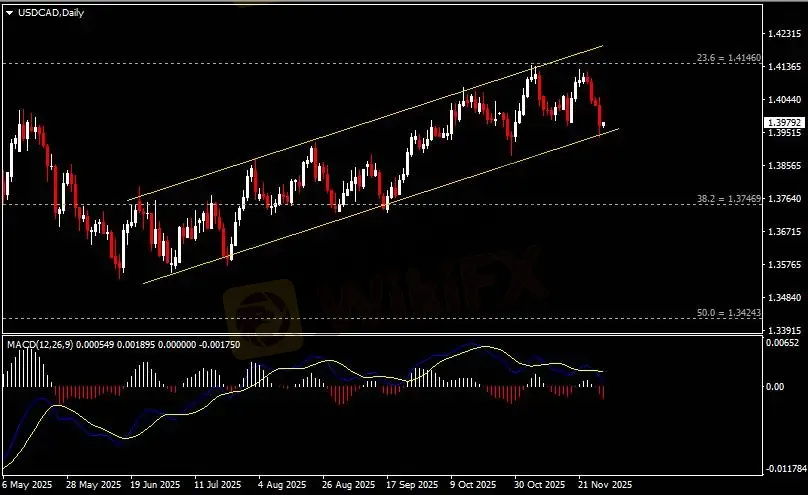 日线图显示美元兑加元震荡下跌,当前测试上行通道底线。从MACD来看,快慢线拐向下行,红色动能柱温和增量。汇价走势基本和动能柱的变化一致。