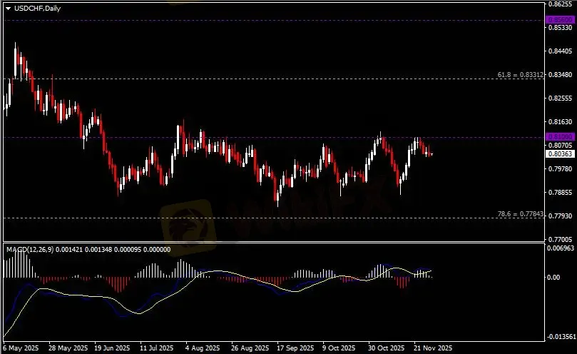 日线图显示美元兑瑞郎回调下跌,当前承压于0.81关键阻力。从MACD来看,快慢线欲形成死叉,白色动能柱温和收缩。汇价走势基本和动能柱的变化一致。