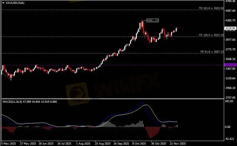 日线图显示金价震荡上涨,当前企稳于4040支撑。从MACD来看,快慢线拐向上行,白色动能柱温和增量。金价走势基本和动能柱的变化一致。
