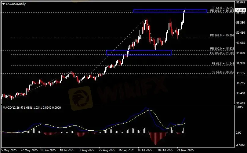 日线图显示银价震荡冲高,当前测试56.15-56.85阻力区域。从MACD来看,快慢线向上扩张,白色动能柱持续放量。银价走势基本和动能柱的变化一致。