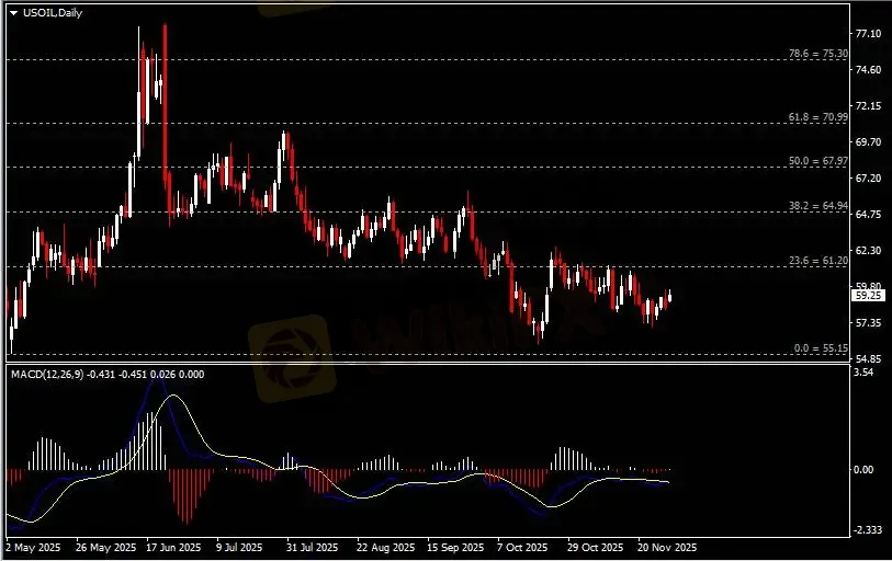 日线图显示油价震荡下挫,当前承压于61.20阻力。从MACD来看,快慢线形成金叉,红色动能柱收缩殆尽。油价走势和动能柱的变化呈分歧。