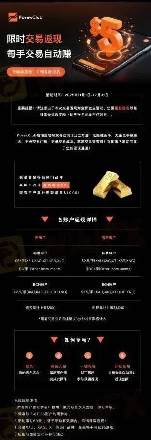 摘要:ForexClub福瑞斯限时交易返现计划盛大开启!——每笔交易自动返现,黄金每手最高返$5!ForexClub福瑞斯限时交易返现计划已开启!无隐藏条件,无最低手数要求,更低交易门槛,更低交易成本,笔笔交易皆有赚!立即报名激活专属于您的返现通道!活动时间:2025年11月1日-12月31日活动详情:活动核心亮点无门槛参与,全用户覆盖!零隐藏条款,透明规则!无论您是新用户还是资深交易者,只需简单操作即