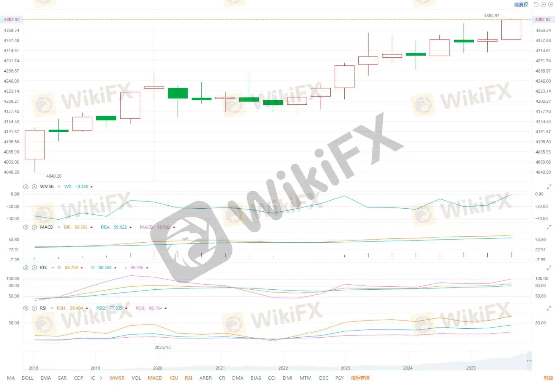 摘要:一、行情回顾速览据 ETO Markets 市场监测显示,上周五(12 月 19 日),现货黄金小幅收涨约 0.14%,报 4338.22 美元/盎司,全周累计上涨约 0.89%。周一(12 月 22 日)亚市早盘,金价延续强势上行,盘中突破 10 月 20 日 创下的前高 4381.484 美元/盎司 ,再度刷新历史纪录。截至发稿,现货黄金交投于 4380.290 美元/盎司附近,日内涨幅接近