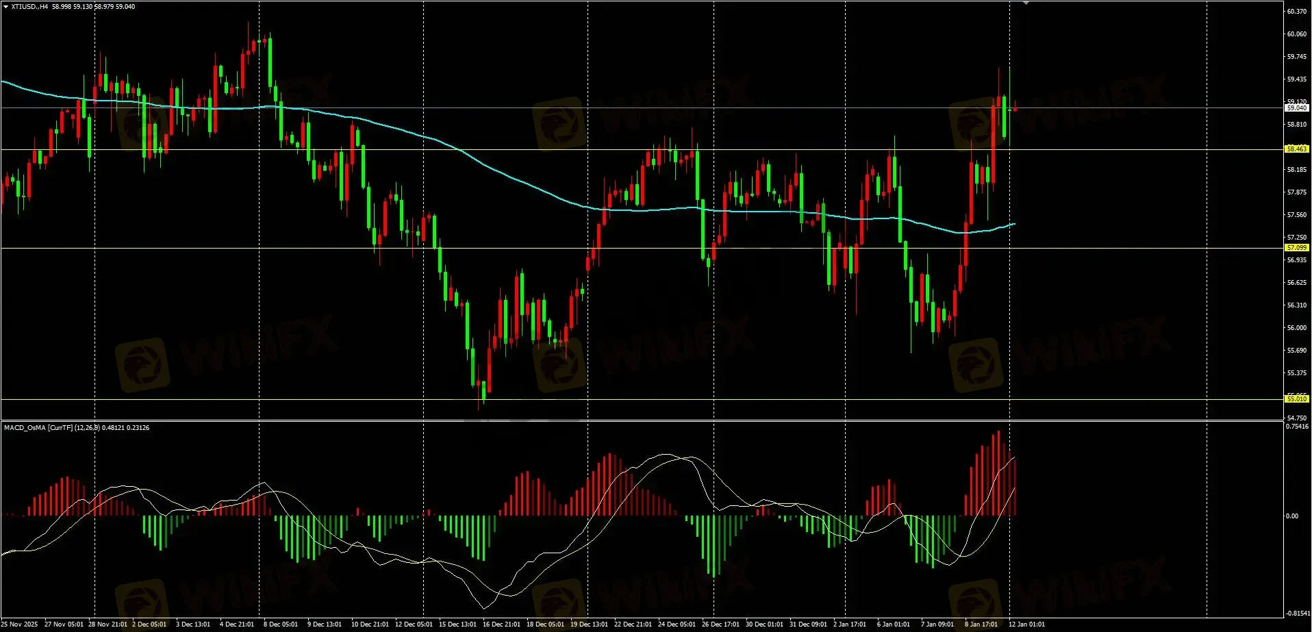 日内策略:上周震荡拉升,周线收阳,确认金叉,本周重点关注日线级别144均线下方压力情况。今日早盘冲高回落,延续H4级别金叉,短线支撑关注58.6,有效下破可尝试短空,下方支撑关注M30级别144均线。上方压力关注59.6,有效上破可继续尝试做多。