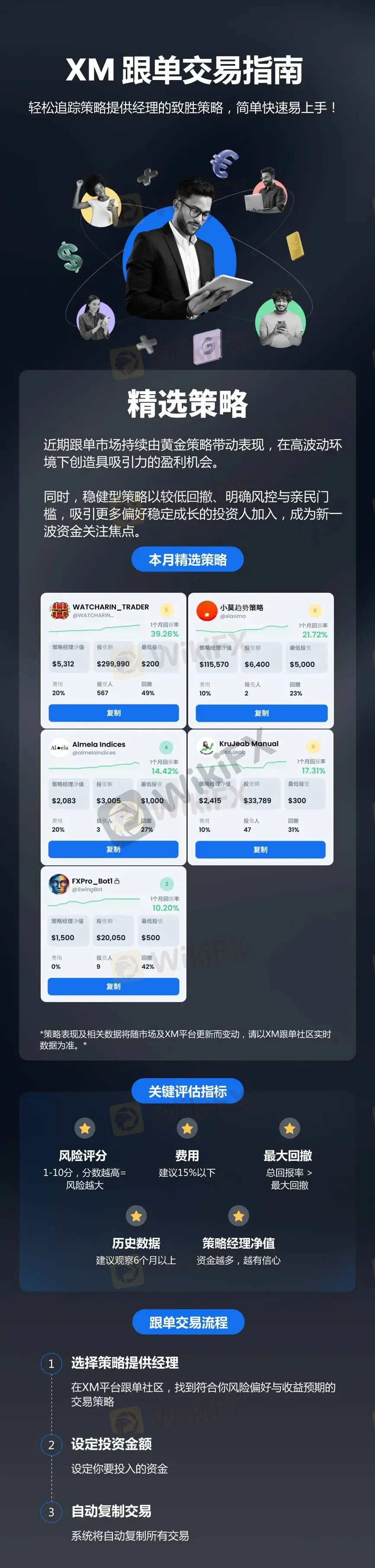 在XM跟单社区(Copy Trading),你可以根据自身风险偏好和交易风格,选择合适的交易策略,系统将自动操作,让你轻松跟单,无需盯盘,即可掌握市场节奏!
