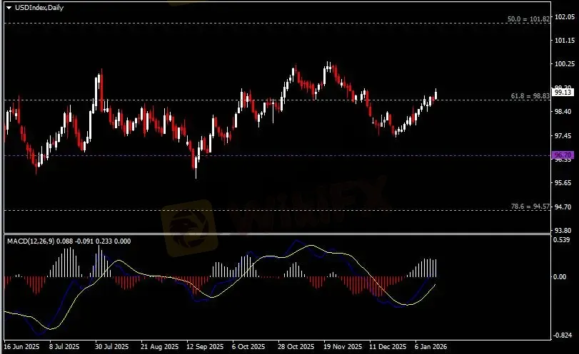 日线图显示美元兑日元小幅回涨,当前逼近158.90阻力。从MACD来看,快慢线向上扩张,白色动能柱则温和收缩。汇价走势和动能柱的变化呈分歧。