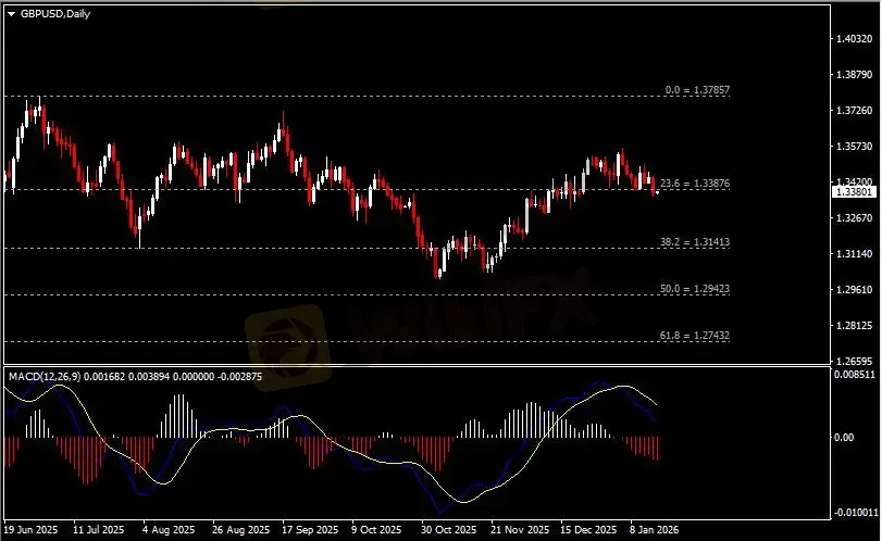 日线图显示英镑兑美元震荡走弱,当前测试1.3390支撑。从MACD来看,快慢线向下运行,红色动能柱温和放量。汇价走势基本和动能柱的变化一致。