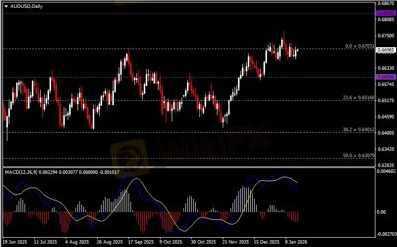 日线图显示澳元兑美元反弹上行,当前测试0.67关键阻力。从MACD来看,快慢线向下运行,红色动能柱则温和收缩。汇价走势基本和动能柱的变化一致。