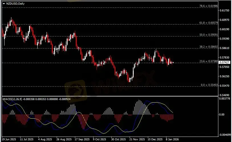 日线图显示纽元兑美元持稳于0.5740支撑。从MACD来看,快慢线向下运行,红色动能柱则温和收缩。汇价走势基本和动能柱的变化一致。