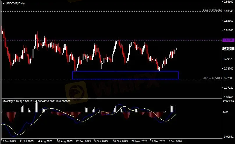 日线图显示美元兑瑞郎震荡上行,当前仍承压于0.81关键阻力。从MACD来看,快慢线向上运行,白色动能柱温和增量。汇价走势基本和动能柱的变化一致。
