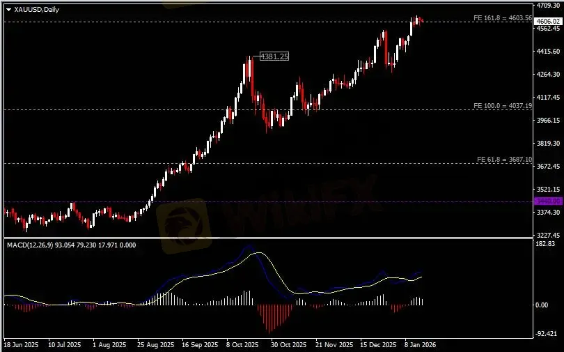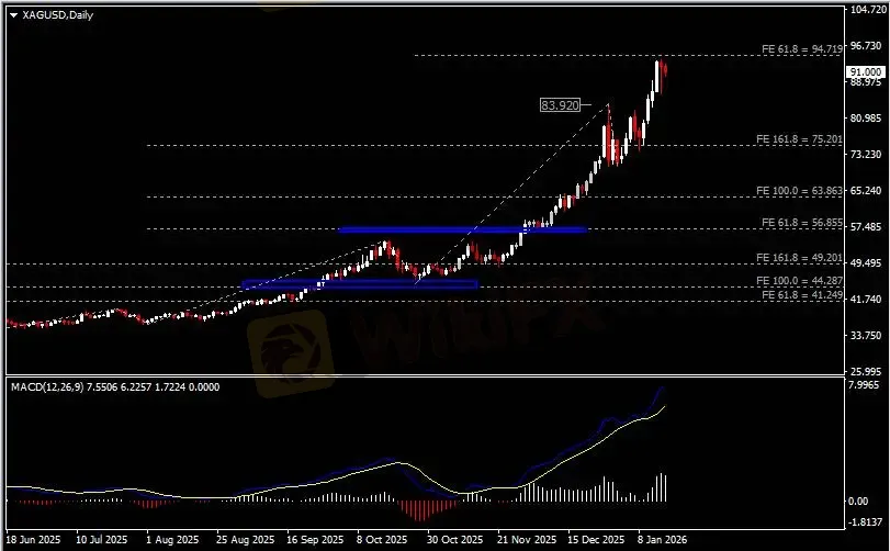 日线图显示银价高位回调,当前承压于94.70关键阻力。从MACD来看,快慢线向上扩张,白色动能柱则温和收缩。银价走势基本和动能柱的变化一致。