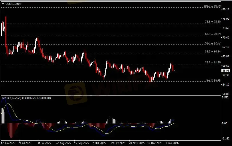 日线图显示油价回调下挫,当前承压于61关键阻力。从MACD来看,快慢线呈拐向,白色动能柱温和收缩。油价走势基本和动能柱的变化一致。