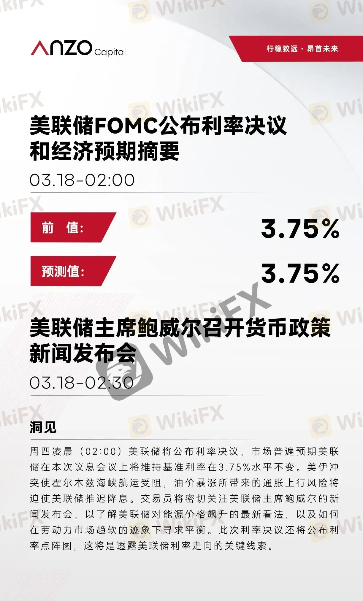 【北京时间·2026年03月18日】美联储利率决议。 周四凌晨(02:00)美联储将公布利率决议,市场普遍预期美联储在本次议息会议上将维持基准利率在3.75%水平不变。美伊冲突使霍尔木兹海峡航运受阻,油价暴涨所带来的通胀上行风险将迫使美联储推迟降息。交易员将密切关注美联储主席鲍威尔的新闻发布会,以了解美联储对能源价格飙升的最新看法,以及如何在劳动力市场趋软的迹象下寻求平衡。此次利率决议还将公布利率点阵图,这将是透露美联储利率走向的关键线索。