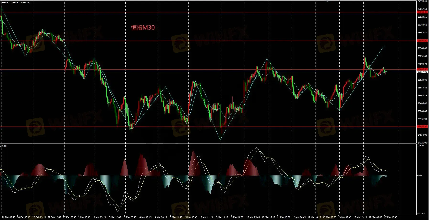 恒指M30昨日的拉升走势已确立目前的多头走势,日内持续看多,关键位置26000。