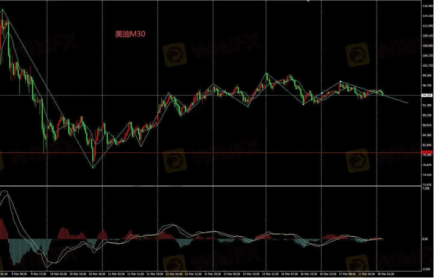 美油M30图表多头暂时回避,谨慎介入多头。