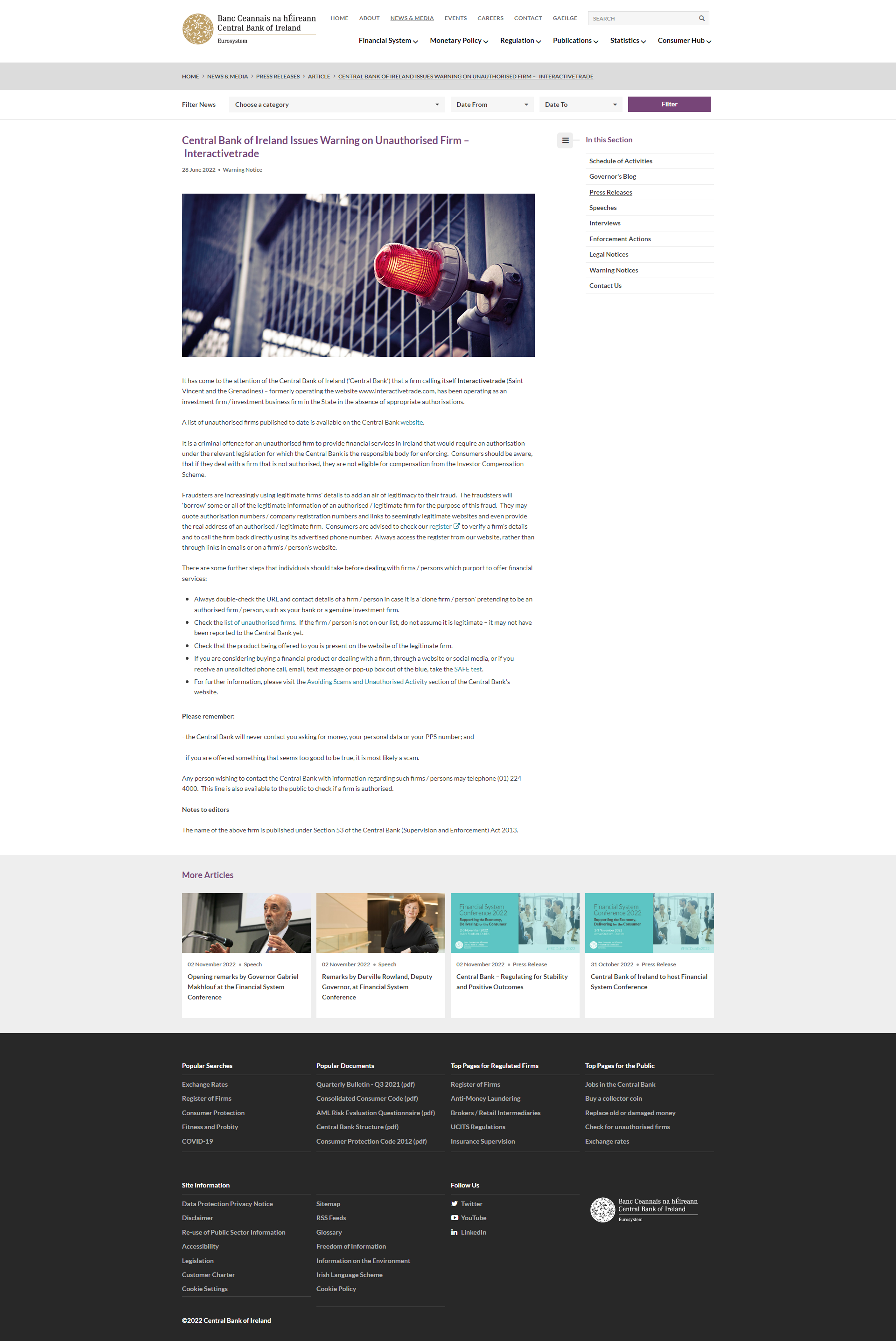 一家自称是爱尔兰中央银行的公司引起了爱尔兰中央银行(“中央银行”)的注意 interactivetrade(圣文森特和格林纳丁斯)——以前经营网站 www. interactivetrade .com,在没有适当授权的情况下一直在该州作为投资公司/投资业务公司运营。迄今为止公布的未经授权公司名单可在中央银行网站上查阅。根据中央银行负责执行的相关立法,未经授权的公司在爱尔兰提供需要获得授权的金融服务属于刑事犯罪。消费者应该知道,如果他们与未经授权的公司打交道,他们就没有资格从投资者补偿计划中获得补偿。欺诈者越来越多地使用合法公司的详细信息来为他们的欺诈行为增添合法性。欺诈者将出于此欺诈目的“借用”授权/合法公司的部分或全部合法信息。他们可能会引用授权号/公司注册号和看似合法网站的链接,甚至提供授权/合法公司的真实地址。建议消费者检查我们的登记册以验证公司的详细信息,并使用其广告电话号码直接给公司回电。始终从我们的网站访问注册表,而不是通过电子邮件或公司/个人网站上的链接。在与声称提供金融服务的公司/个人打交道之前,个人应该采取一些进一步的步骤:始终仔细检查公司/个人的 URL 和联系方式,以防它是假装的“克隆公司/个人”授权公司/个人,例如您的银行或真正的投资公司。检查未经授权的公司名单。如果公司/个人不在我们的名单上,请不要认为它是合法的——它可能还没有报告给中央银行。检查提供给您的产品是否出现在合法公司的网站上。如果您正在考虑通过网站或社交媒体购买金融产品或与公司打交道,或者如果您突然收到未经请求的电话、电子邮件、短信或弹出框,请参加安全测试。如需更多信息,请访问中央银行网站的避免诈骗和未经授权的活动部分。请记住:- 中央银行绝不会联系您索取金钱、您的个人数据或您的 PPS 号码;并且 - 如果向您提供的东西好得令人难以置信,那很可能是骗局。任何希望就此类公司/个人的信息联系中央银行的人都可以致电 (01) 224 4000。公众也可以使用此热线查询公司是否获得授权。