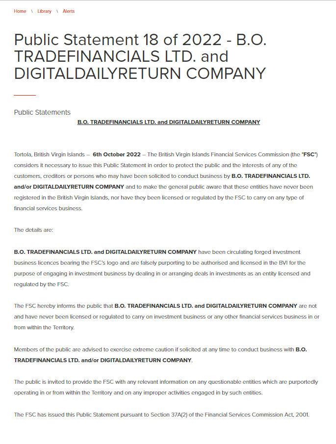 2022 年第 18 号公开声明 - bo tradefinancials ltd.和 Digitaldailyreturn公司公开声明 bo tradefinancials ltd.和 Digitaldailyreturn英属维尔京群岛托尔托拉公司——2022 年 10 月 6 日——英属维尔京群岛金融服务委员会(“fsc”)认为有必要发布此公开声明,以保护公众和任何客户、债权人或个人的利益谁可能已被 bo tradefinancials ltd. 招揽开展业务。和/或 Digitaldailyreturn公司并让公众知道这些实体从未在英属维尔京群岛注册,也没有获得 fsc 的许可或监管以开展任何类型的金融服务业务。详情是:bo tradefinancials ltd.和 Digitaldailyreturn公司一直在流通带有 fsc 标志的伪造投资业务许可证,并谎称在英属维尔京群岛获得授权和许可,目的是通过作为 fsc 许可和监管的实体进行投资交易或安排投资交易来从事投资业务。 fsc 特此通知公众,bo tradefinancials ltd.和 Digitaldailyreturn公司没有也从未获得许可或受监管在境内或从境内开展投资业务或任何其他金融服务业务。如果在任何时候被要求与 bo tradefinancials ltd. 开展业务,建议公众格外小心。和/或 Digitaldailyreturn公司。请公众向金融服务委员会提供有关据称在领土内或从领土内经营的任何可疑实体以及此类实体从事的任何不当活动的任何相关信息。 FSC 根据 2001 年金融服务委员会法第 37a(2) 条发布了这份公开声明。
