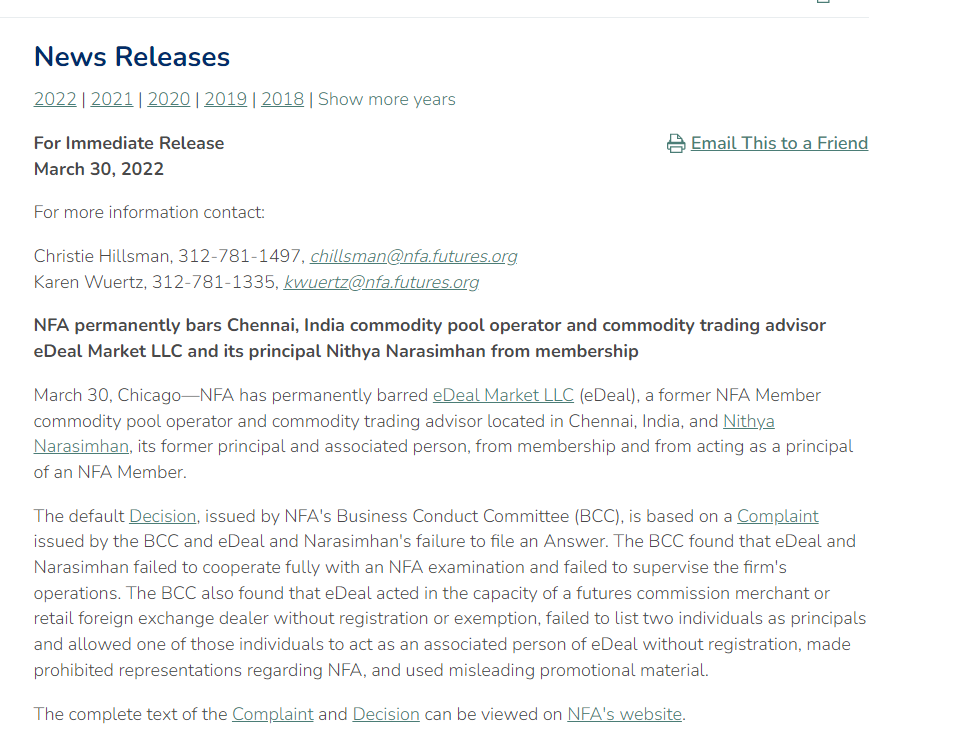 NFA 永久禁止印度钦奈商品池运营商和商品交易顾问 eDeal Market LLC 及其主要负责人 Nithya Narasimhan 成为会员。