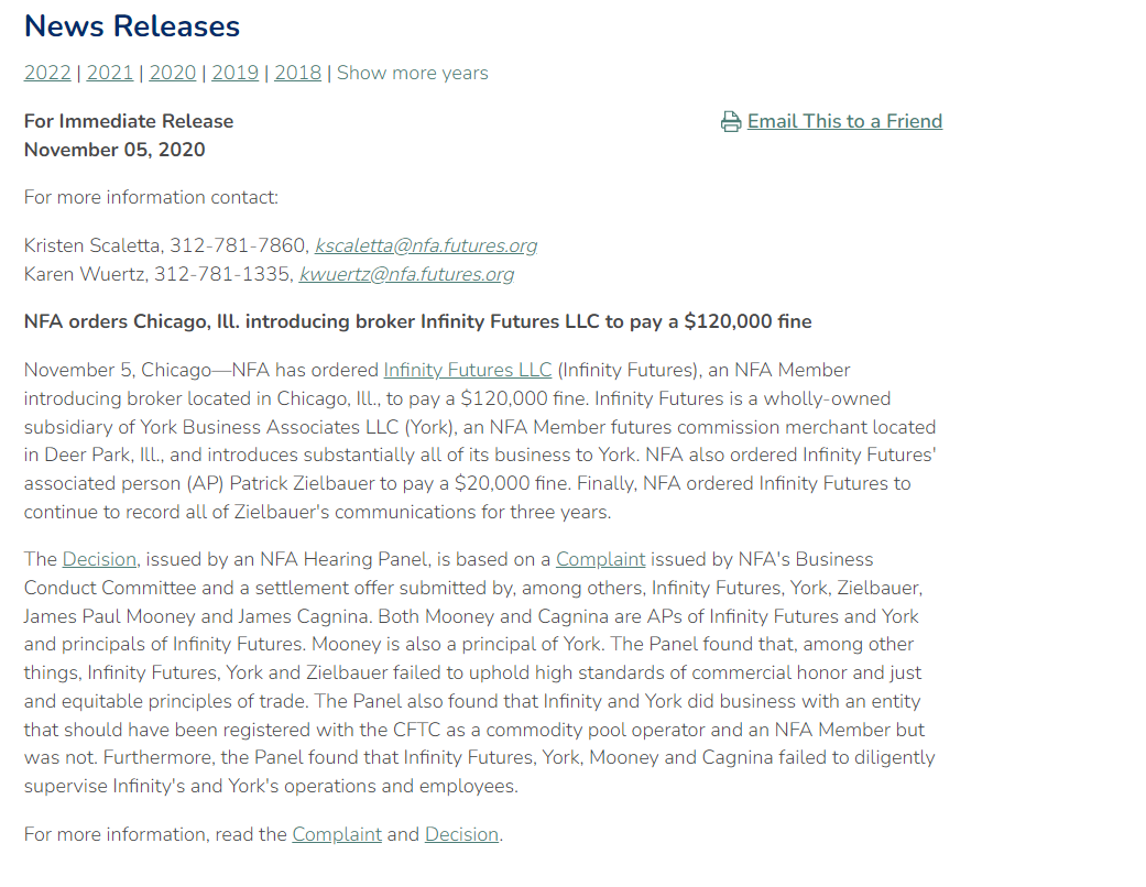 新闻稿 2022 | 2021 | 年2020 | 2019 | 2018 | Show more years 通过电子邮件将其发送给朋友,以便于 2020 年 11 月 5 日立即发布以获取更多信息,请联系:kristen scaletta,312-781-7860,kscaletta@nfa.futures.org karen wuertz,312-781-1335,kwuertz@nfa.futures。 org nfa 订购芝加哥,病了。介绍经纪人 Infinity Futuresllc 将在 11 月 5 日支付 120,000 美元的罚款,芝加哥——NFA 已下令 Infinity Futures有限责任公司( Infinity Futures ),一名 nfa 会员介绍位于伊利诺伊州芝加哥的经纪人,支付 120,000 美元的罚款。 Infinity Futures是 york business associates llc (york) 的全资子公司,是位于伊利诺伊州迪尔帕克的 nfa 成员期货佣金商,并将其大部分业务引入约克。 nfa也下令 Infinity Futures相关人员 (ap) patrick zielbauer 支付 20,000 美元的罚款。最后,nfa 下令 Infinity Futures继续记录 zielbauer 三年的所有通信。该决定由 nfa 听证小组发布,其依据是 nfa 商业行为委员会提出的投诉和提交的和解提议,其中包括: Infinity Futures , york, zielbauer, james paul mooney 和 james cagnina。 mooney 和 cagnina 都是 ap Infinity Futures纽约和校长 Infinity Futures.穆尼也是约克的校长。小组发现,除其他事项外, Infinity Futures , york 和 zielbauer 未能坚持高标准的商业荣誉和公正公平的贸易原则。专家组还发现,infinity 和 york 与一家实体开展业务,该实体本应在美国商品期货交易委员会注册为商品基金运营商和 NFA 成员,但事实并非如此。此外,小组发现 Infinity Futures, york, mooney 和 cagnina 未能尽职监督 infinity 和 york 的运营和员工。如需更多信息,请阅读投诉和决定。