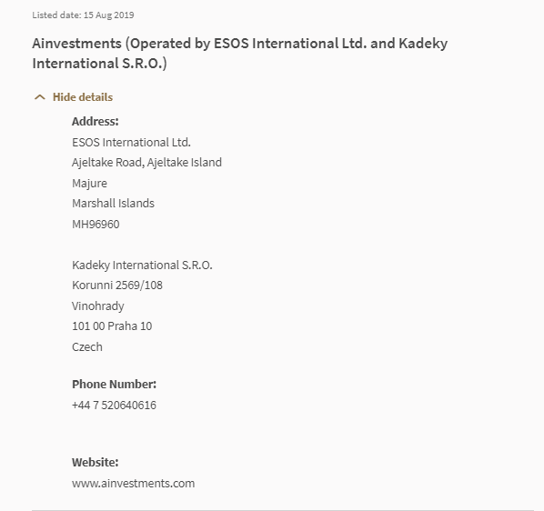 “投资者警示名单 投资者警示名单提供了一份名单,根据 MAS 可获得的信息,这些人员:i) 可能或可能被错误地认为是获得许可或以任何其他方式由 Mas 授权或监管的;ii) 已经做出商业信托或集体投资计划中的单位要约可能被或可能被错误地认为是经 MAS 授权、认可或注册的;iii) 已做出可能或可能被错误地认为是的投资要约在向 mas 提交或注册的文件中制作或附有该文件。此清单并非详尽无遗,而是基于 mas 在发布时所知的内容。上市日期:2019年8月15日 Ainvestments(由经营 ESOS International Ltd.和 kadeky international sro) 隐藏详情地址: ESOS International Ltd . ajeltake road, ajeltake island majure 马绍尔群岛 mh96960 kadeky international sro korunni 2569/108 vinohrady 101 00 praha 10 捷克电话号码:+44 7 520640616 网站:www. Ainvestments .com