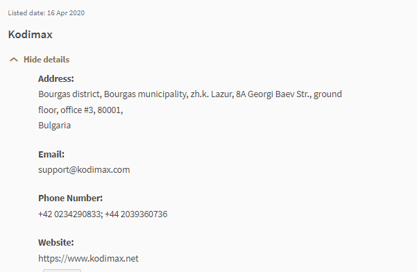 “投资者警示名单 投资者警示名单提供了一份名单,根据 MAS 可获得的信息,这些人员:i) 可能或可能被错误地认为是获得许可或以任何其他方式由 Mas 授权或监管的;ii) 已经做出商业信托或集体投资计划中的单位要约可能被或可能被错误地认为是经 MAS 授权、认可或注册的;iii) 已做出可能或可能被错误地认为是的投资要约在向 mas 提交或注册的文件中制作或附有该文件。此清单并非详尽无遗,而是基于 mas 在发布时所知的内容。上市日期:2020年4月16日 Kodimax隐藏详细信息地址:布尔加斯区,布尔加斯市,zh.k。 lazur, 8a georgi baev str., ground floor, office #3, 80001, bulgaria 电子邮件:support@ Kodimax .com 电话号码:+42 0234290833; +44 2039360736 网址:https://www. Kodimax 。网