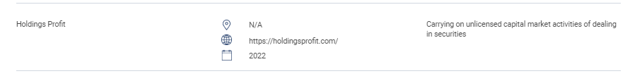 "本节包含未经授权的网站、投资产品、公司和个人的清单。该清单包括:未经证券委员会许可而进行或自称进行以下受监管活动的人员:证券交易;衍生品交易;基金管理;就公司财务提供建议;投资建议;财务规划;以及从事私人退休计划的交易。 ” Holdings Profit不适用 https://holdingsprofit.com/ 2022 进行未经许可的资本市场证券交易活动