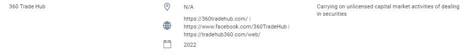 "本节包含未经授权的网站、投资产品、公司和个人的清单。该清单包括:未经证券委员会许可进行或自称进行以下受监管活动的人员:证券交易;衍生品交易;基金管理;就公司财务提供建议;投资建议;财务规划;以及从事私人退休计划的交易。 " 360 trade hub 不适用 https://360tradehub.com/ | https://www.facebook.com/ 360TradeHub | https://tradehub360.com/web/ 2022 进行未经许可的资本市场证券交易活动