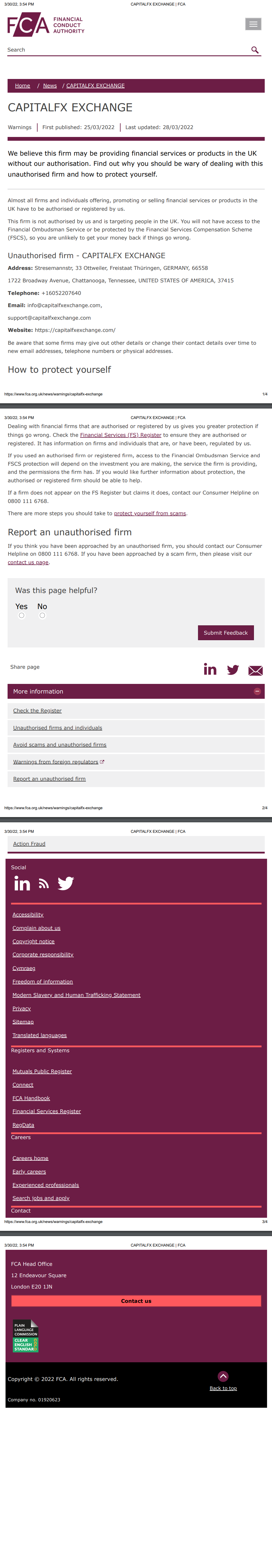 CapitalFx交换(https:// CapitalFx Exchange.com/) 30/03/2022 英国 CapitalFx我们认为该公司可能在未经我们授权的情况下在英国提供金融服务或产品。了解为什么您应该警惕与这家未经授权的公司打交道以及如何保护自己。几乎所有在英国提供、推广或销售金融服务或产品的公司和个人都必须获得我们的授权或注册。该公司未经我们授权,其目标客户是英国人。您将无法获得金融监察员服务,也无法受到金融服务补偿计划 (FSC) 的保护,因此,如果出现问题,您不太可能拿回资金。未经授权的公司—— CapitalFx交换地址:stresemannstr, 33 ottweiler, freistaat thüringen, germany, 66558 1722 Broadway avenue, chattanooga, tennessee, United States of america, 37415 电话:+16052207640 电子邮件:info@ CapitalFx Exchange.com,支持@ CapitalFx Exchange.com 网站:https:// CapitalFx Exchange.com/ 请注意,一些公司可能会提供其他详细信息,或随着时间的推移将其联系方式更改为新的电子邮件地址、电话号码或实际地址。如何保护自己 与我们授权或注册的金融公司打交道可以在出现问题时为您提供更大的保护。检查金融服务 (fs) 登记册以确保它们已获得授权或注册。它包含有关受我们监管或曾经受我们监管的公司和个人的信息。如果您使用授权公司或注册公司,获得金融监察员服务和 FSC 保护将取决于您进行的投资、公司提供的服务以及公司拥有的权限。如果您想了解有关保护的更多信息,授权或注册公司应该能够提供帮助。如果一家公司并未出现在 fs 登记册上,但声称已出现,请拨打我们的消费者帮助热线 0800 111 6768。您还应该采取更多措施来保护自己免受诈骗。举报未经授权的公司 如果您认为未经授权的公司与您联系,您应该拨打我们的消费者帮助热线 0800 111 6768。如果您与诈骗公司联系,请访问我们的联系我们页面。