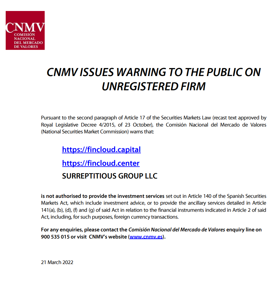 秘密集团有限公司 (https:// FinCloud 。中心; https:// FinCloud .capital) 23/03/2022 西班牙 cnmv 根据《证券市场法》(经 10 月 23 日第 4/2015 号皇家立法令批准的重订文本)第 17 条第 2 款向公众发出关于未注册公司的警告,委员会nacional del Mercado de valores(国家证券市场委员会)警告:秘密集团有限责任公司无权提供《西班牙证券市场法》第 140 条规定的投资服务(其中包括投资建议),或提供《西班牙证券市场法》第 140 条中详述的辅助服务。该法第141(a)、(b)、(d)、(f)和(g)条涉及该法第2条所述的金融工具,包括为此目的的外币交易。如有任何疑问,请拨打国家经济委员会咨询热线 900 535 015 或访问 cnmv 网站 (www.cnmv.es)。 2022 年 3 月 21 日.