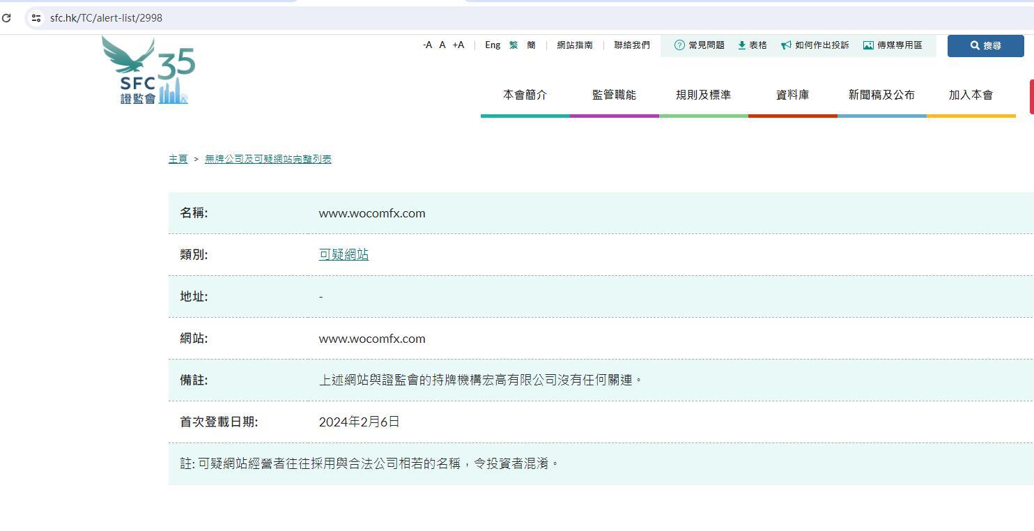 无牌公司及可疑网站名单列出了没有在香港领取牌照,并引起了证监会关注的公司。这些公司被怀疑现正或曾经以香港投资者为推销对象,又或声称与香港有联系。你可按名称或类别进行搜寻,以查证某公司是否已列入名单内。此名单并非详尽无遗。由于证监会经常都会发现一些值得注意的公司或网站, 因此我们会不时在名单内加入新的名称。若你曾经被无牌公司接触,请利用我们的网上投诉表格。有关锅炉室,欺诈网站和伪冒电邮的进一步资料,请按相关连结。注:无牌公司及可疑网站名单旨在及早向投资者发出警报。投资者不能只依赖上述名单的资料,他们需自行审慎查核个别公司的详情。请选取各栏内容名称的首个英文字母以取览名单,或点击“中文名称”栏目浏览只具中文名称的公司。 " 名称: www. Wocom fx.com 类别: 可疑网站地址: - 网站: www. Wocom fx.com 备注: 上述网站与证监会的持牌机构宏高有限公司没有任何关连。首次登载日期: 2024年2月6日注: 可疑网站经营者往往采用与合法公司相若的名称,令投资者混淆。
