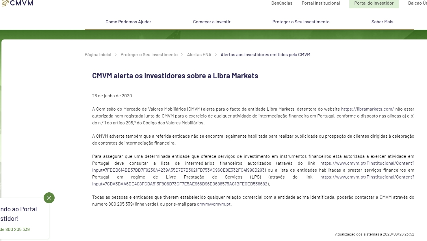 2020 年 6 月 26 日,证券市场委员会 (cmvm) 警告实体 Libra Markets,根据第 295 条第 1 款 a) 和 b) 款的规定,网站 https://libramarkets.com/ 的所有者未获得 cmvm 授权或注册,无法在葡萄牙开展任何金融中介活动。 º 证券代码。 cmvm 还警告称,上述实体不具备为签订金融中介合同而进行广告或寻找客户的法律资格。为确保提供金融工具投资服务的特定实体获得授权在葡萄牙开展活动,您必须查阅授权金融中介机构列表(通过链接 https://www.cmvm.pt/pinstitucional/content?input =7fdeb614bb37bb7f9236a4239a55d7d7b3621fd753ac96ce8e332fc41998d293 )或根据免费提供服务(lps)制度授权在葡萄牙提供金融服务的实体列表(通过链接 https://www.cmvm.pt/pinstituucional/content?input=7cda3baa6de408fcda51 3f806d73cf7e5ae966d96e0686575ac1bfe0eb536682)。与上述实体建立任何商业关系的所有个人和实体均可通过电话号码 800 205 339(绿线)或发送电子邮件至 cmvm@cmvm.pt 联系 cmvm。系统更新时间:2020/06/26 23:52