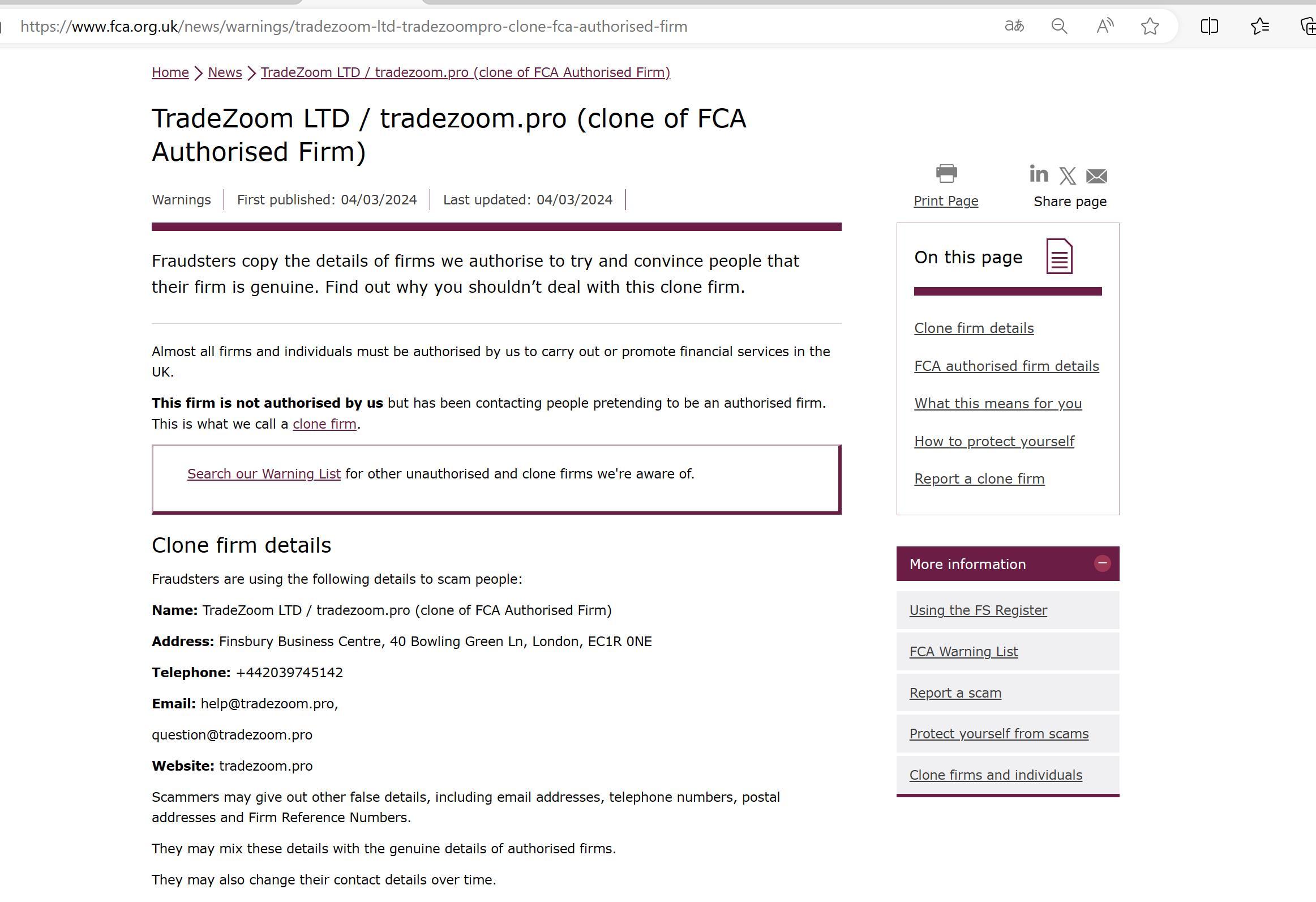 FCA未经授权公司警告名单 TradeZoom有限公司 / tradezoom.pro.