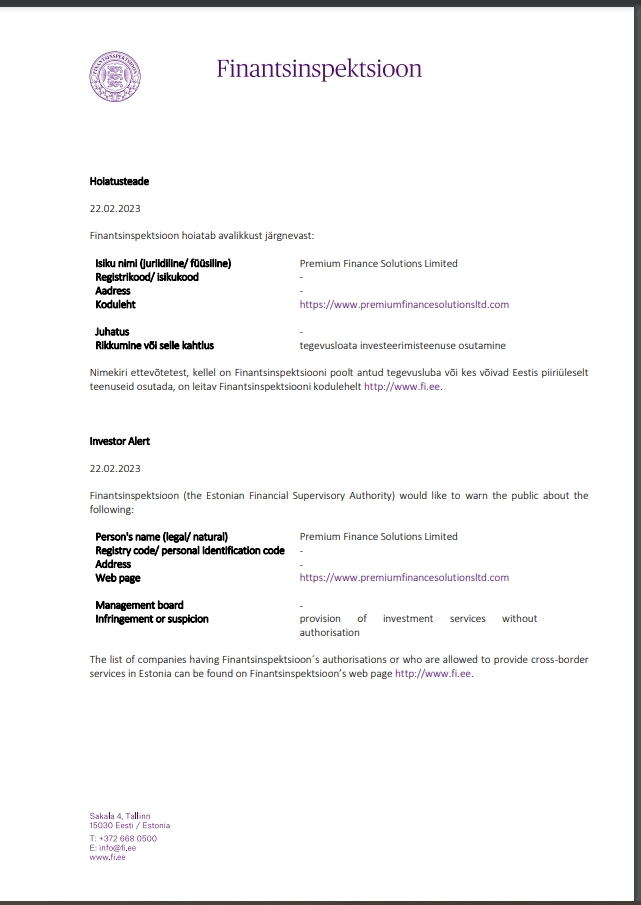 警告通知 2023 年 2 月 22 日,金融监察局就以下事项向公众发出警告: 人员姓名(法人/实体) Premium Finance Solutions Limited注册代码/个人识别码 - 地址 - 网站 https://www.premiumfinancesolutionsltd.com 董事会 - 违规或涉嫌违规 未经营业执照提供投资服务 拥有金融监管局授予营业执照的公司名单或者可以在爱沙尼亚金融监管局网站 http://www.fi.ee 上找到可以提供跨境服务的机构。投资者警报 22.02.2023 金融监管局(爱沙尼亚金融监管局)谨就以下事项向公众发出警告: 个人姓名(法定/自然) Premium Finance Solutions Limited注册码/个人识别码 - 地址 - 网页 https://www.premiumfinancesolutionsltd.com 管理委员会 - 侵权或涉嫌擅自提供投资服务 经金融检查授权或获准提供跨境服务的公司名单可以在爱沙尼亚金融监管局的网页 http://www.fi.ee 上找到。